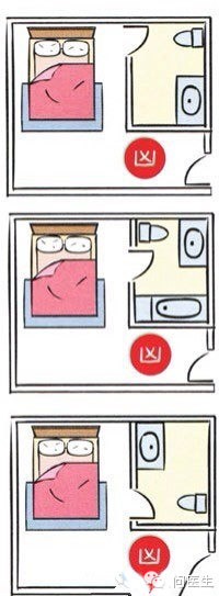 房间里的厕所对到床,情况比房门对到厕所严重,对到头,会头痛、思考时不能集中,住久了会产生肿瘤、中风等;对到腰,会腰酸、心脏无力、水肿,住久了会产生糖尿病、心脏病;对到脚,会坐骨酸痛、膝盖无力、痛风水肿,住久了会产生意外骨折。