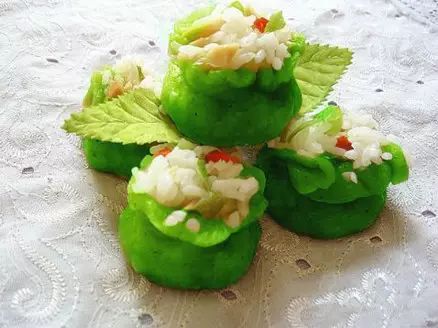 食材:300g面粉、70g糯米、50g火腿肠、30g胡萝卜、2g盐、3ml香油、5g葱、2g鸡精、适量菠菜。