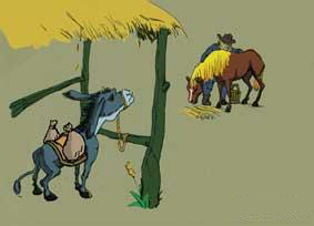 狗告别后,在墙角遇到了猫。狗说:“伙计,我刚才去看了驴,这位大哥实在太累了,它说它想歇一天。也难怪,主人给它的活儿太多太重了。”