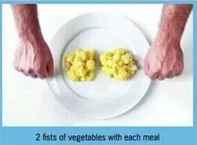 蔬菜的摄入量与蛋白质一样也是男女有别。男女每餐摄入量分别为2拳和1拳大小,蔬菜的厚度及直径与拳头相当。