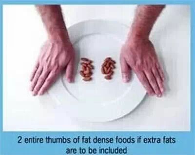 男女每餐摄入量分别为2个拇指和1个拇指大小。脂肪不仅仅包含食用油,肉类中的脂肪,平时吃的零食坚果中也含有一定量的脂肪,所以要特别注意哦~