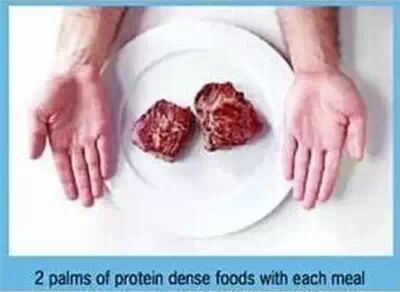 在蛋白质方面,男性与女性的摄入量有所不同。男性为2个掌心,女性则为1个掌心;量则需要与掌心的大小和厚度相当。