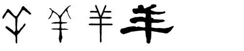 从左到右,依次为甲骨文、金文、篆文、隶书的“羊”字。