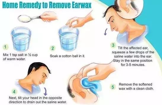 方法一:可以用盐水清理耳朵。将盐水滴入耳道中,摇晃几下,然后冲洗干净。