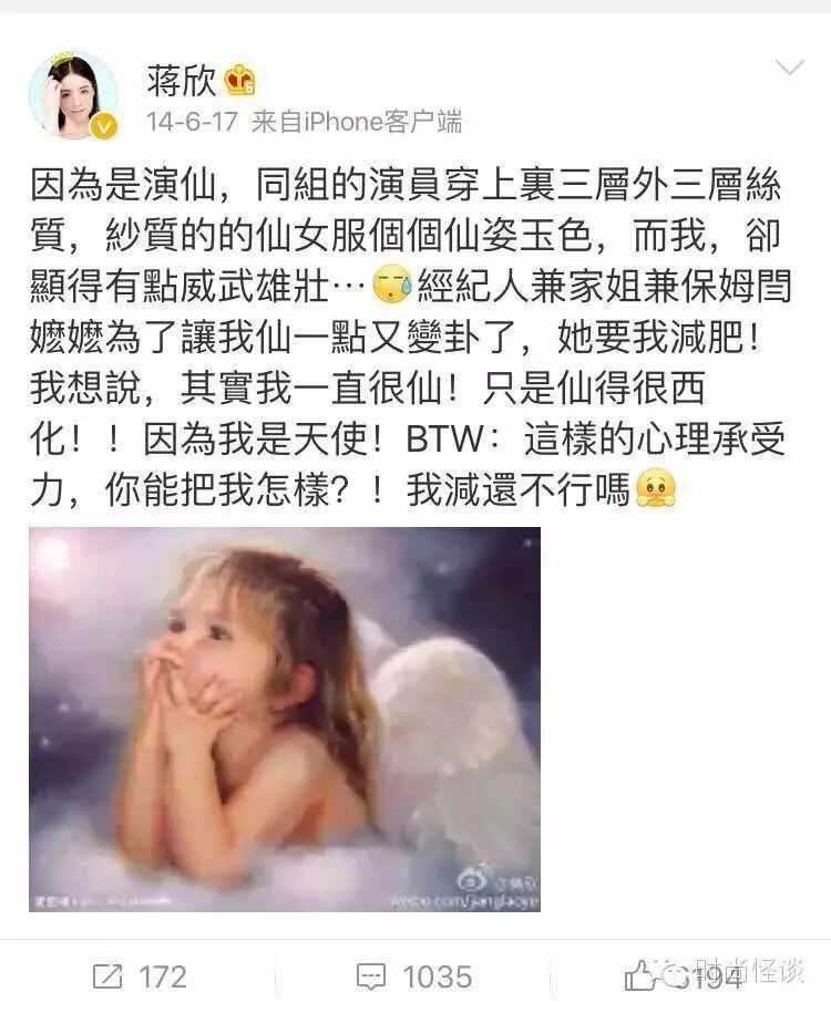 好吧,既然你们如此有兴趣,那么我们就来聊一下蒋欣的体重吧(WTF,F你的原则呢)