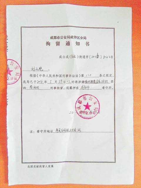 拘留通知书指符海陆涉嫌「煽动颠覆国家政权罪」被刑事拘留