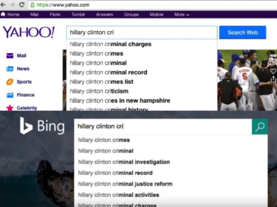 但如此同时,如果你在Yahoo和Bing搜索引擎上输入Hillary Clinton Cri这些字,你得到的推荐选项却大相径庭: