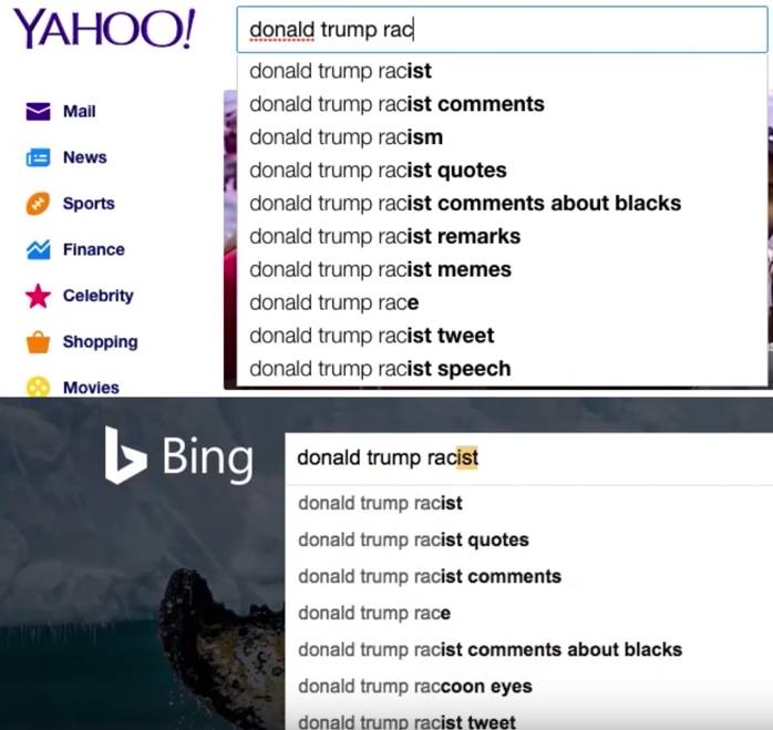 然后你在yahoo和bing上搜索希拉里的donald trum rac的时候,得到的推荐选项是这样的: