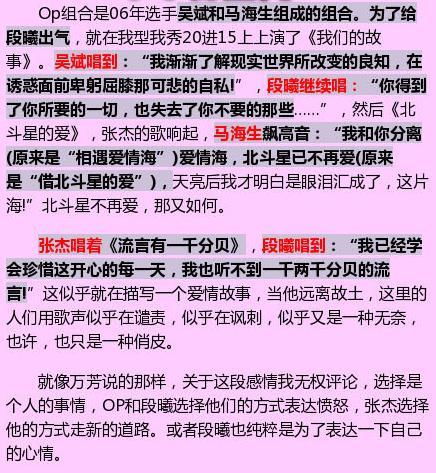 这不,在张杰参加快男后,段曦与OP组合在型秀舞台上改编歌曲说张杰负心于段曦。。