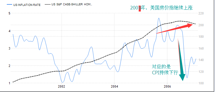 (黑色虚线,美国房价指数,蓝线美国CPI)