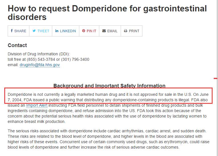 禁令:2004年,美国FDA发文称,美国不允许多潘立酮在美国销售,并禁止任何含有多潘立酮成分药物在美国境内散布。