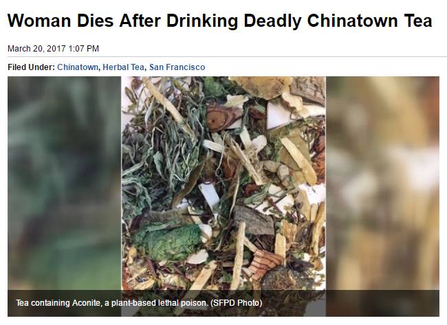 前段时候美国就有个大新闻,两位顾客在加州三藩市华埠某参茸药行购买了中药茶包后,饮用一小时内就出现了不同程度的身体不适,疑似药材中毒,被紧急送往医院救治。上周六,中毒的其中一名56岁中年女子在医院被宣告不治身亡,再次将案件推上了风口浪尖。