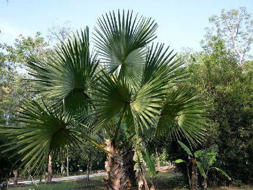 贝叶棕是棕榈科,贝叶棕属植株高大粗壮乔木状植物,高可达25米,具较密的环状叶痕。叶片大,半月型,呈扇状深裂,裂片裂至中部,剑形,叶柄粗壮,上面有沟槽,边缘具短齿,花序顶生直立、圆锥形,序轴上由佛焰苞所包被,上面着生花;花两性,小,乳白色,有臭味。果实球形,种子近球形或卵球形,胚顶生。2-4月开花,翌年5-6月结果。