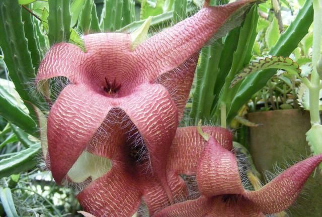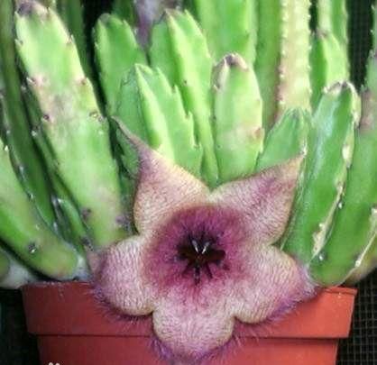 大花魔星花为萝藦科,多年生肉质草本,别称大花犀角,原产于南非,植株在基部多分枝,呈丛状,向上直立生长,肉质茎,灰绿色,茎粗,四角棱状,棱边有齿状突起及很短的柔毛,茎高20公分~30公分,茎粗约3公分~4公分。花期约6~9月,花从嫩茎基部长出,花苞呈菱形,气囊状,形似个小鸡蛋,裂开成5瓣张开,型似海星,又有人称它“海星花”,花大,直径约15厘米~20厘米,花瓣内具紫红色丝毛,边缘密生紫褐色细毛。它的花朵带有些许腐臭味,并不是很好闻,故又有人叫它“臭肉花”,因此也就只能吸引苍蝇来帮忙授粉了。