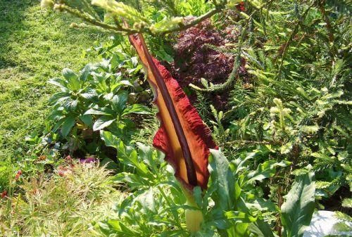 伏都百合,是天南星科龙线属的一种。这种花卉的特点是其巨大的紫色花苞和花序,并散发出一种让人联想到尸体的气味,以吸引其花粉传播者,如绿蝇。
