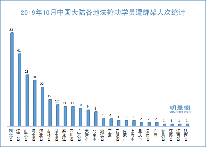 ![]() 图1:2019年10月大陆法轮功学员遭中共迫害人次统计 |