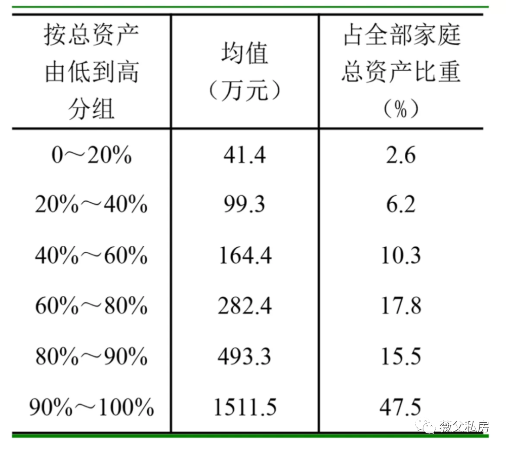 根据报告,总资产最高的前20%家庭,其总资产占比,达到了63%;前10%家庭的总资产占比为,达到了47.5%,而最低的后20%家庭,资产占比仅为,2.6%。