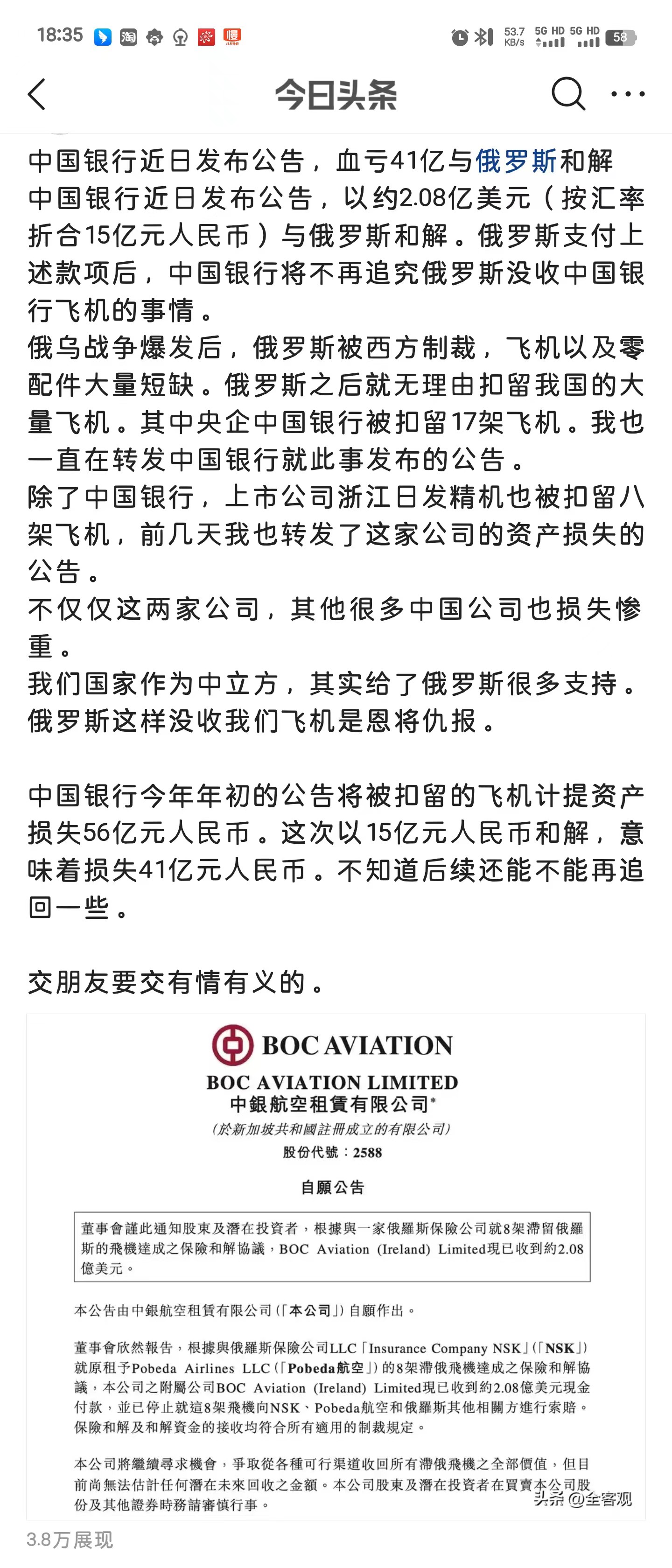 阿波罗网林亿报道/11月10日,中银航空在港交所公告,根据与俄罗斯保险公司NSK就原租予Pobeda胜利航空的8架滞留俄罗斯的飞机达成的保险和解协议,附属公司BOC Aviation(Ireland)Limited现已收到约2.08亿美元现金付款,并已停止就这8架飞机向NSK、Pobeda航空和俄罗斯其他相关方进行索赔。