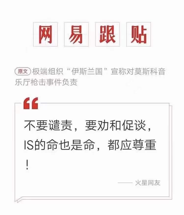 在IS宣布对莫斯科恐袭负责后,还有一些网友留言嘲讽,要中共当局采取俄罗斯入侵乌克兰和哈马斯恐袭以色列之后的做法,继续“和稀泥”甚至变相支持施暴者。