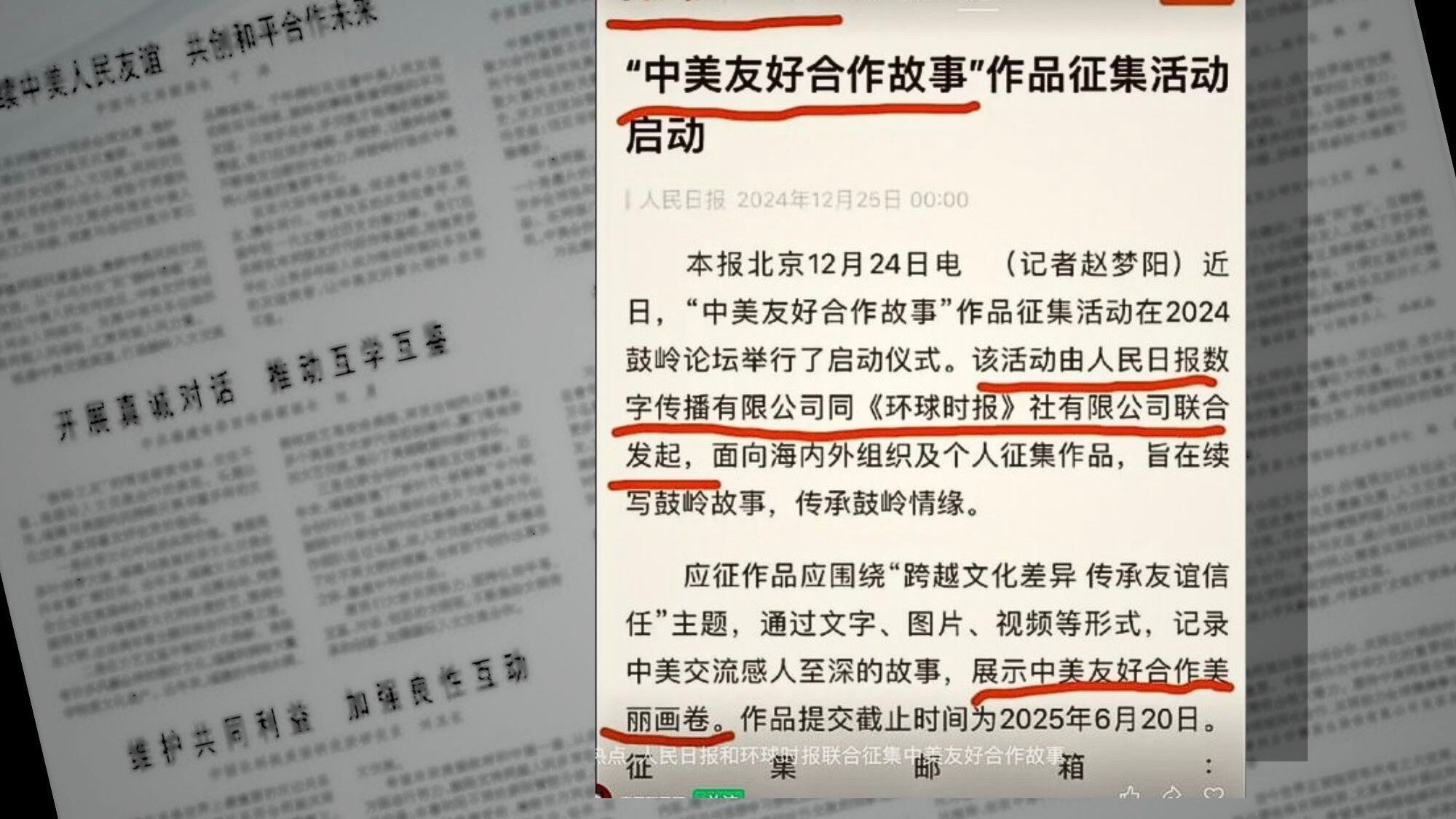 在全球局势复杂多变、中美关系处于微妙转折之际,12月25日,中共中央机关报《人民日报》和《环球时报》宣布启动“中美友好合作故事”作品征集活动。此次活动以“跨越文化差异,传承友谊信任”为主题,面向海内外组织及个人征集作品,涵盖文字、图片和视频等多种形式,宣称要展现中美两国在文化、经济及社会交流中的感人故事。活动将持续半年,截稿时间为2025年6月20日。