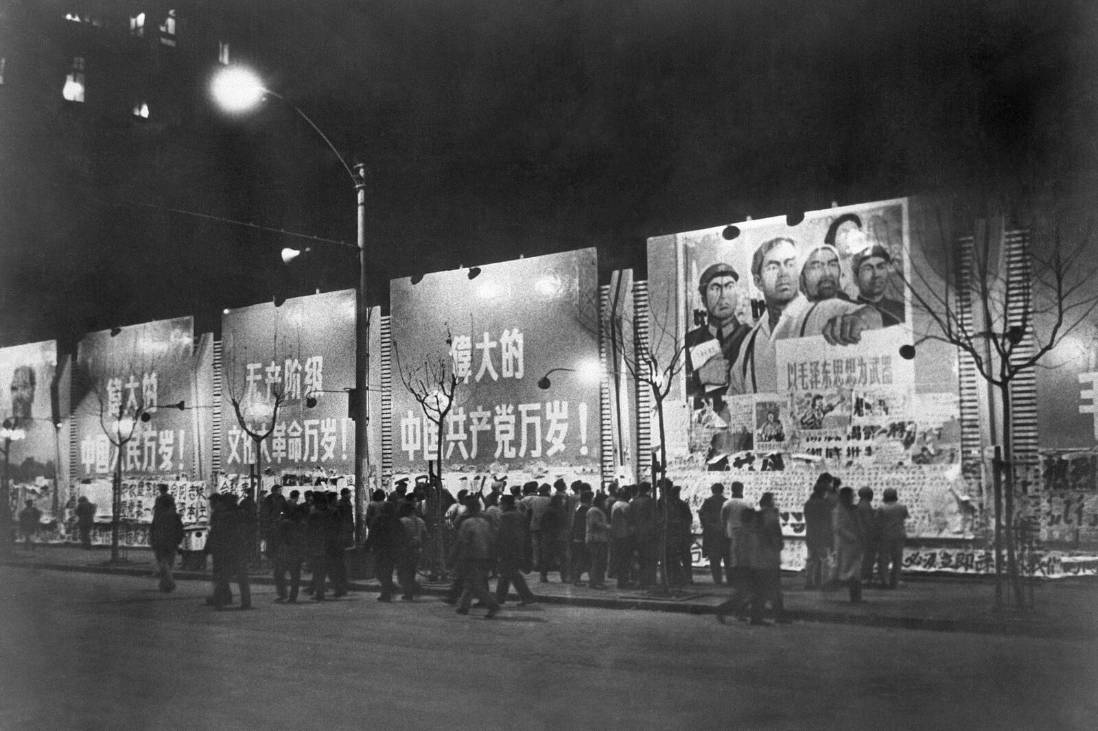 档案照:1967年1月6日,文革时期,上海民众在南京街头灯光公告板前阅读墙报。(美联社)