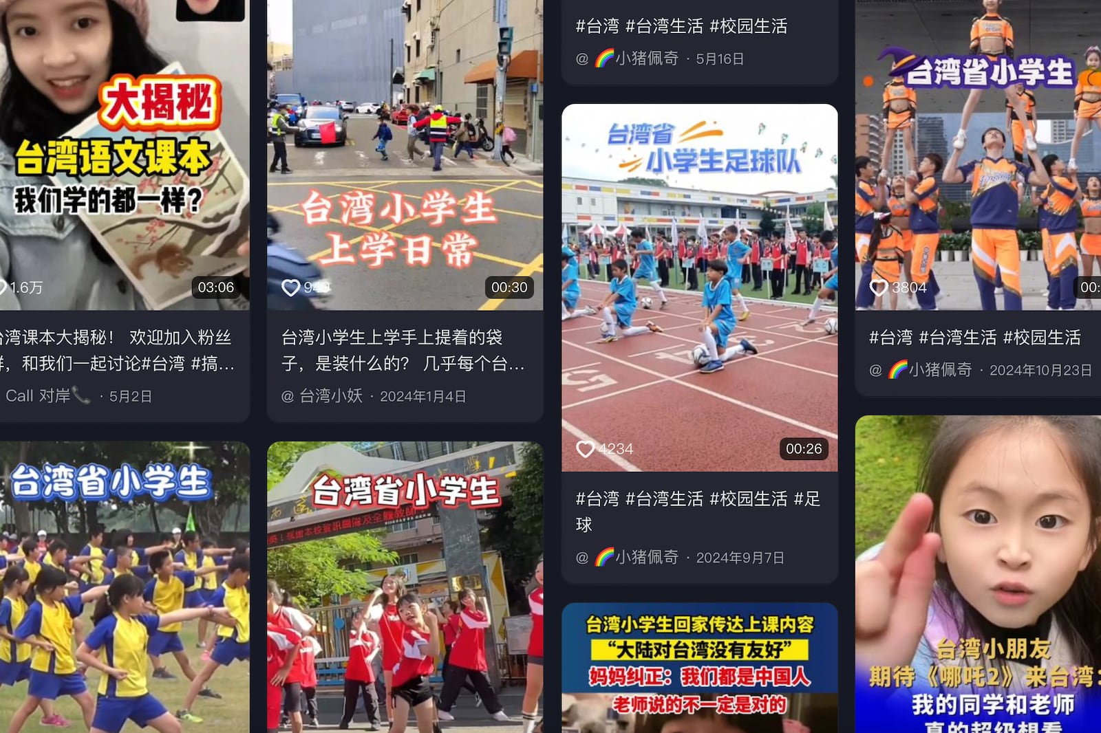 RFA记者在中国社群平台抖音、小红书搜寻“台湾小学生”,发现大量短视频拍摄台湾小学生日常,更进到校园拍学生盛饭吃营养午餐、学生穿汉服跳民俗舞蹈,或踢足球、吹口风琴等。学校名称、校训“礼义廉耻”都入境。有中配直播主说:“台湾的小学过年过节老师不能收礼,没有学费、餐费,只有一点书本费,父母也没有压力”。