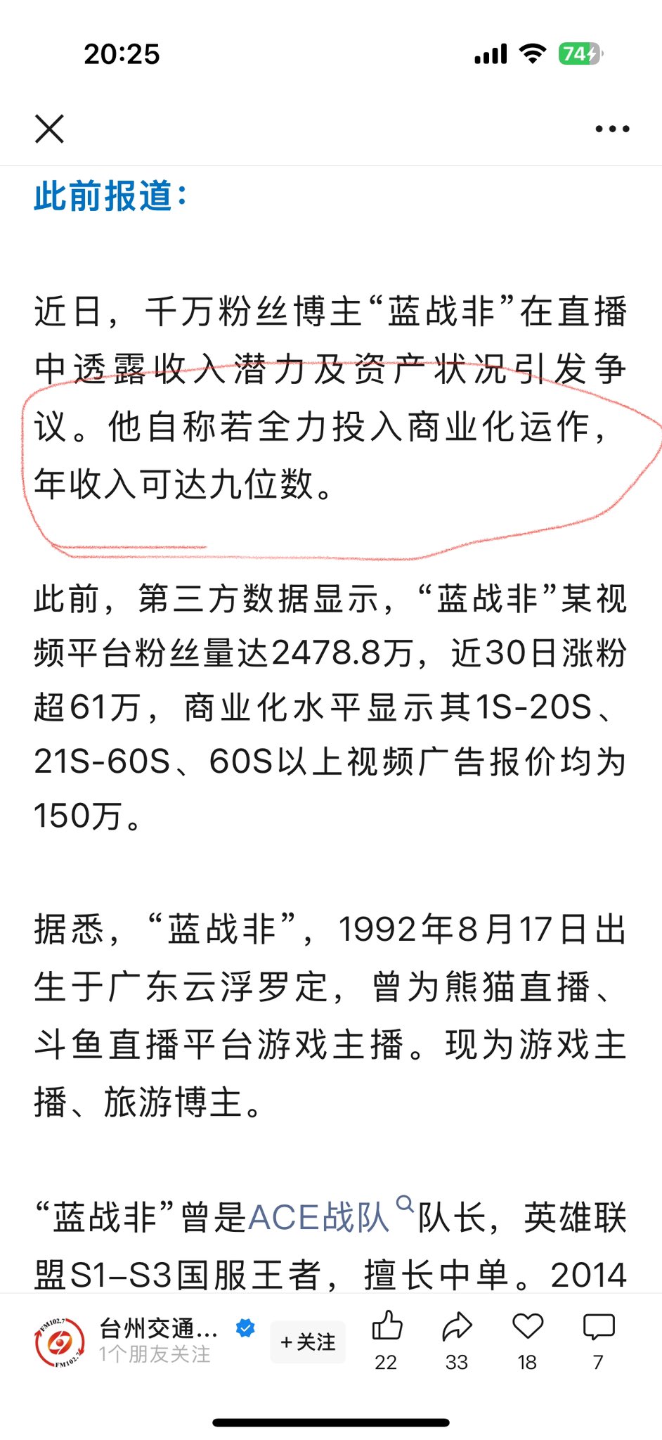 “蓝战非”曾在直播中称若全力投入商业化运作,年收入可达九位数,并透露其短视频广告报价为每条150万元,近30天涨粉超61万。