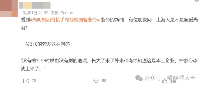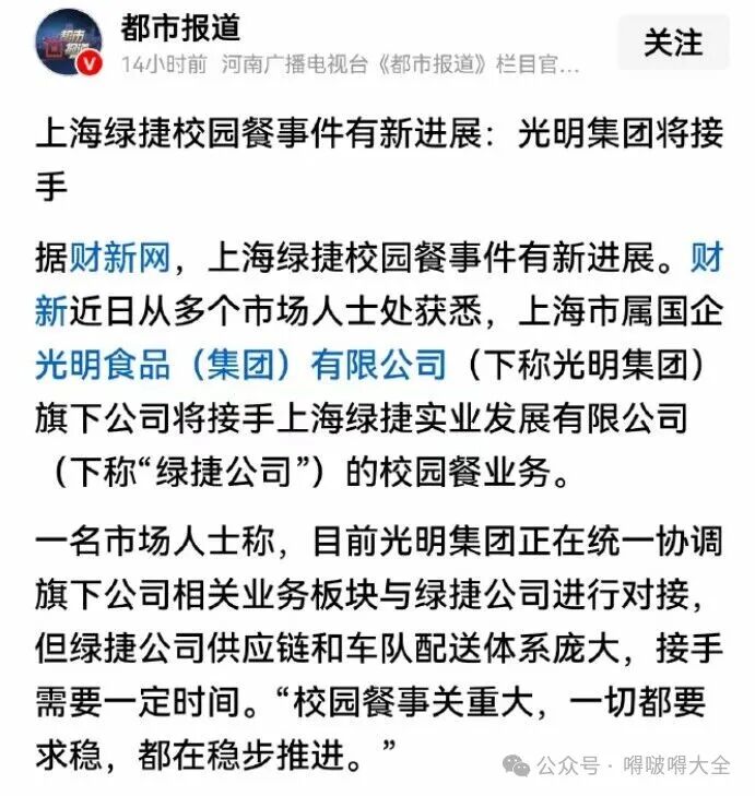 说起来,这个“新进展”不“新”,因为前几天关于上海光明集团将接手上海绿捷校园餐的消息已经出现在热搜上了。只不过那时消息来源还是自媒体、个人用户,未必准确。