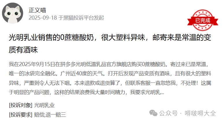 虽然上海光明的鲜奶业务,覆盖了上海100多万家庭。但鲜奶毕竟是流水线的产物,品控方面还是更容易控制。但即便如此,去黑猫投诉平台搜索一下,也会有关于产品质量方面的投诉信息。