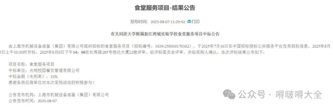 但网上关于他们中标校园餐的信息不多,我只找到两条信息,光明校园餐饮管理有限公司分别中标了同济大学附属新江湾城实验学校和华师大松江实验高级中学。
