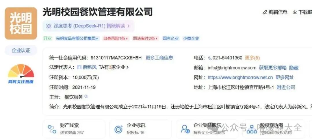 上海光明集团旗下的“光明校园餐饮管理有限公司”,本身就在从事校园餐业务。