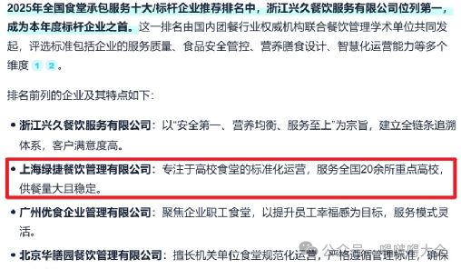我当然知道,现在说上海绿捷是校园餐的专业公司会招来一片骂声,但你到网上搜搜就能看到这样的信息:中国团餐百强企业、农业产业化上海市重点龙头企业(2024年)、连续5年获“中国团餐十大品牌”、多次承担进博会餐饮保障等等信息。
