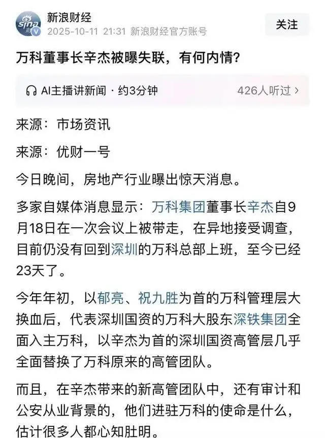 10月11号晚上,楼市和股市的朋友圈几乎同时炸了锅。一条没头没尾的消息像惊雷似的传开:“万科董事长辛杰被带走了,都失联23天了!”