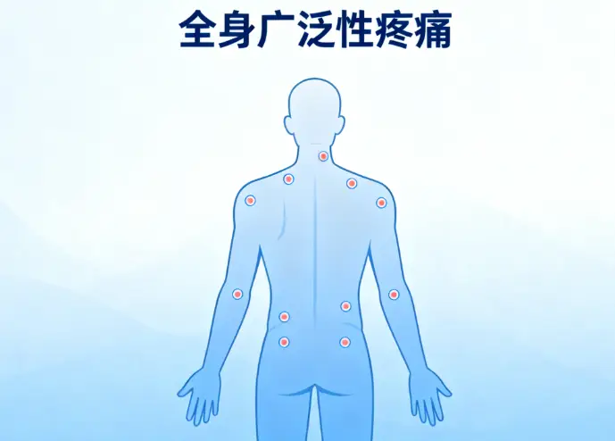 纤维肌痛的特点是在特定部位会出现多个压痛点,同时伴有持续的广泛性疼痛。患者常描述这种疼痛为"全身都在痛",从颈部、肩部到腰背部,甚至四肢都会感到不适。这种疼痛往往在早晨特别明显,伴随着僵直感,活动后可能稍有好转,但劳累后又会加重。