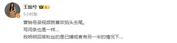近日,杜淳妻子王灿在直播中说因戏生情的演员不专业,引发热议。18日,王灿回应相关热搜表示:“营销号录视频就喜欢掐头去尾。写词条也是一样…我明明回答粉丝的是已婚或者有另一半的情况下…”