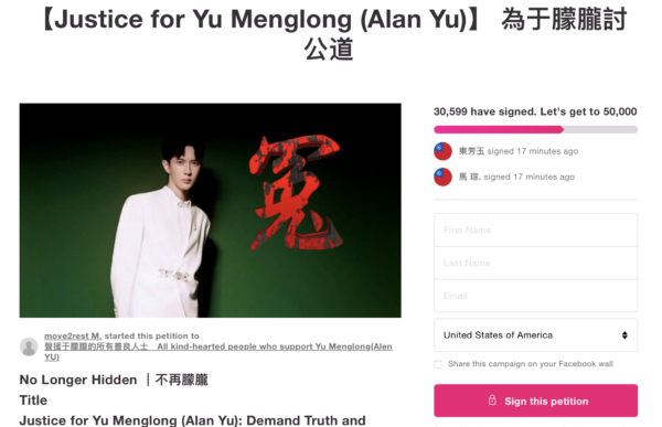 相关链接:https://secure.avaaz.org/community_petitions/en/sheng_yuan_yu_meng_long_de_suo_you_shan_liang_ren__justice_for_yu_menglong_alan_yu_wei_yu_meng_long_tao_gong_dao/?utm_source=copy&utm_medium=social_share&utm_campaign=1748244&utm_term=cerxBub+en&share_location=do_landing