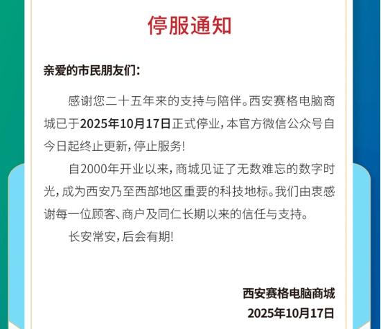 10月17日,西安赛格电脑商城发布了《停服通知》。通知表示,10月17日电脑商城“正式停业”,“本官方微信公众号自今日(10月17日)起终止更新,停止服务。”
