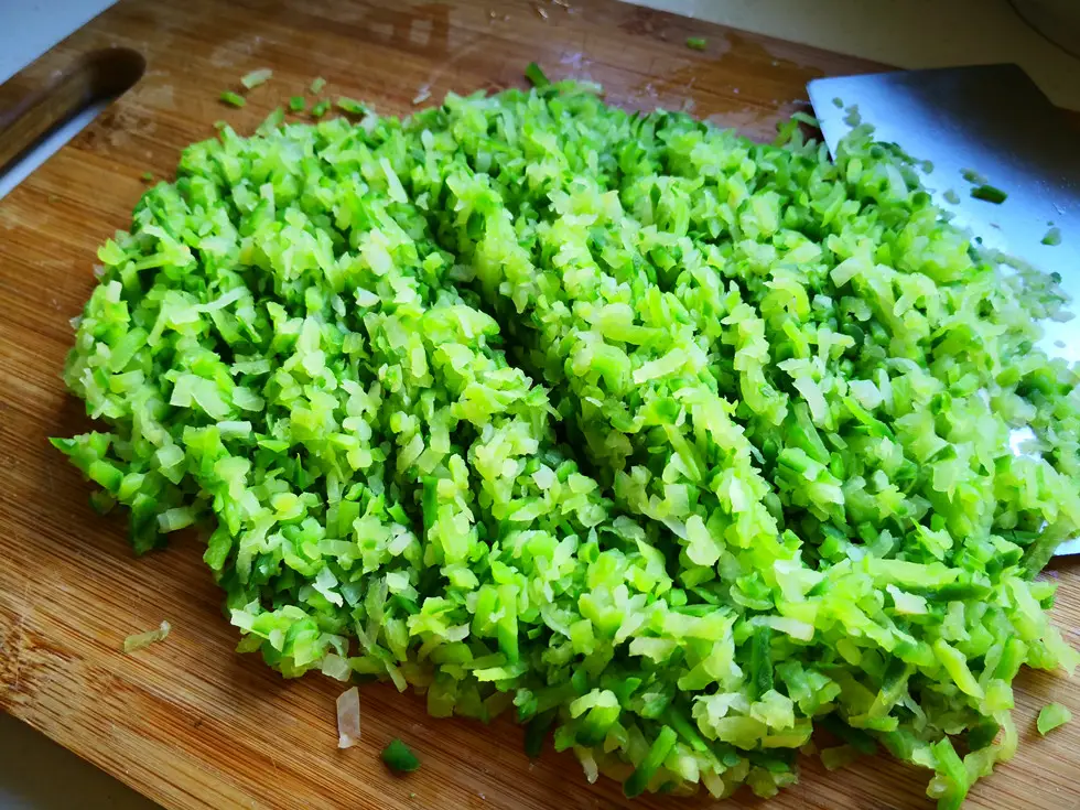 挤干净水分的萝卜丝放到菜板上切碎剁细,然后放到大碗里,加入适量香油搅拌均匀,锁住萝卜的鲜味和水分。