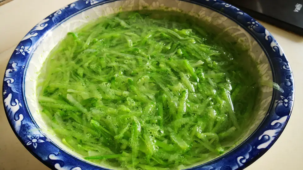 先把萝卜仔细洗干净,用擦菜板擦成细细的萝卜丝,起锅烧水,水开了以后加入半勺食盐,把萝卜丝倒入锅中焯烫2分钟,这一步是为了去除萝卜的辛辣味。