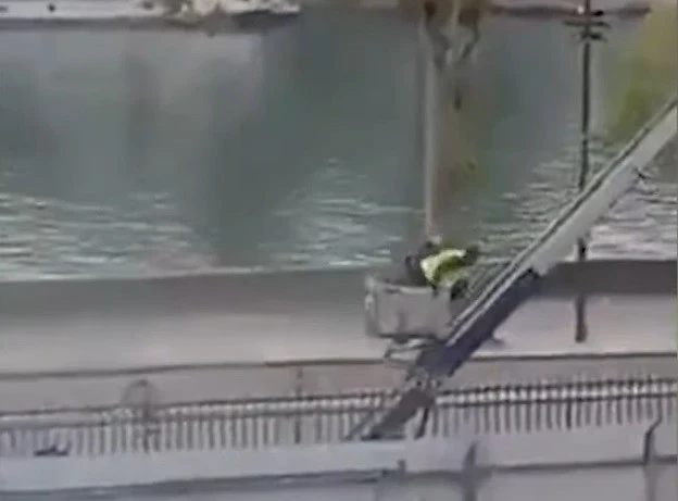 罗浮宫窃贼搭机械升降梯逃逸。(取自YouTube@Guardian News)