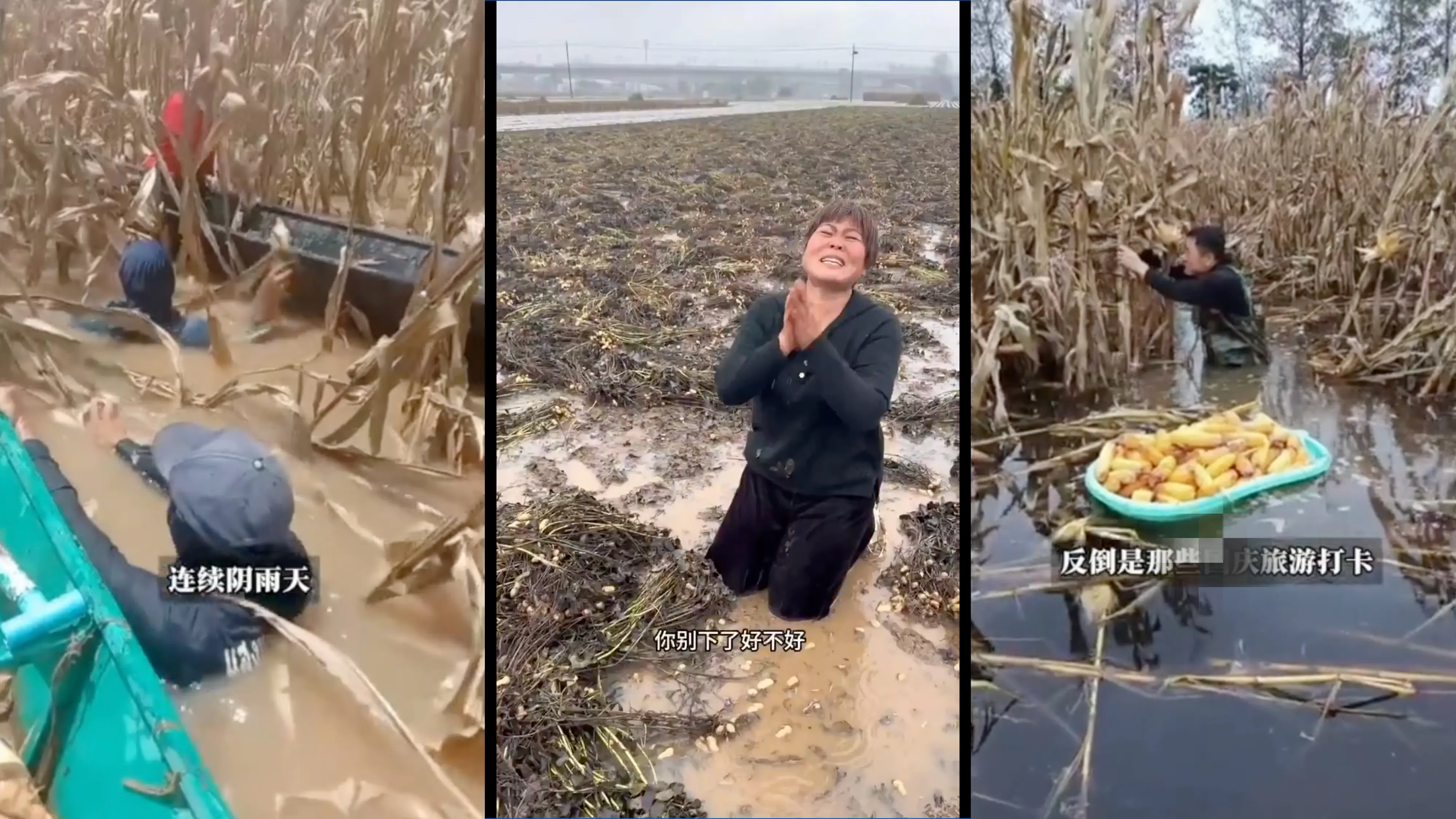 持续的降雨让原本金黄一片的丰收景象变成泥泞沼泽。大面积花生、玉米等秋收作物因无法及时收割,出现发芽、霉变、根系腐烂倒伏等严重问题。