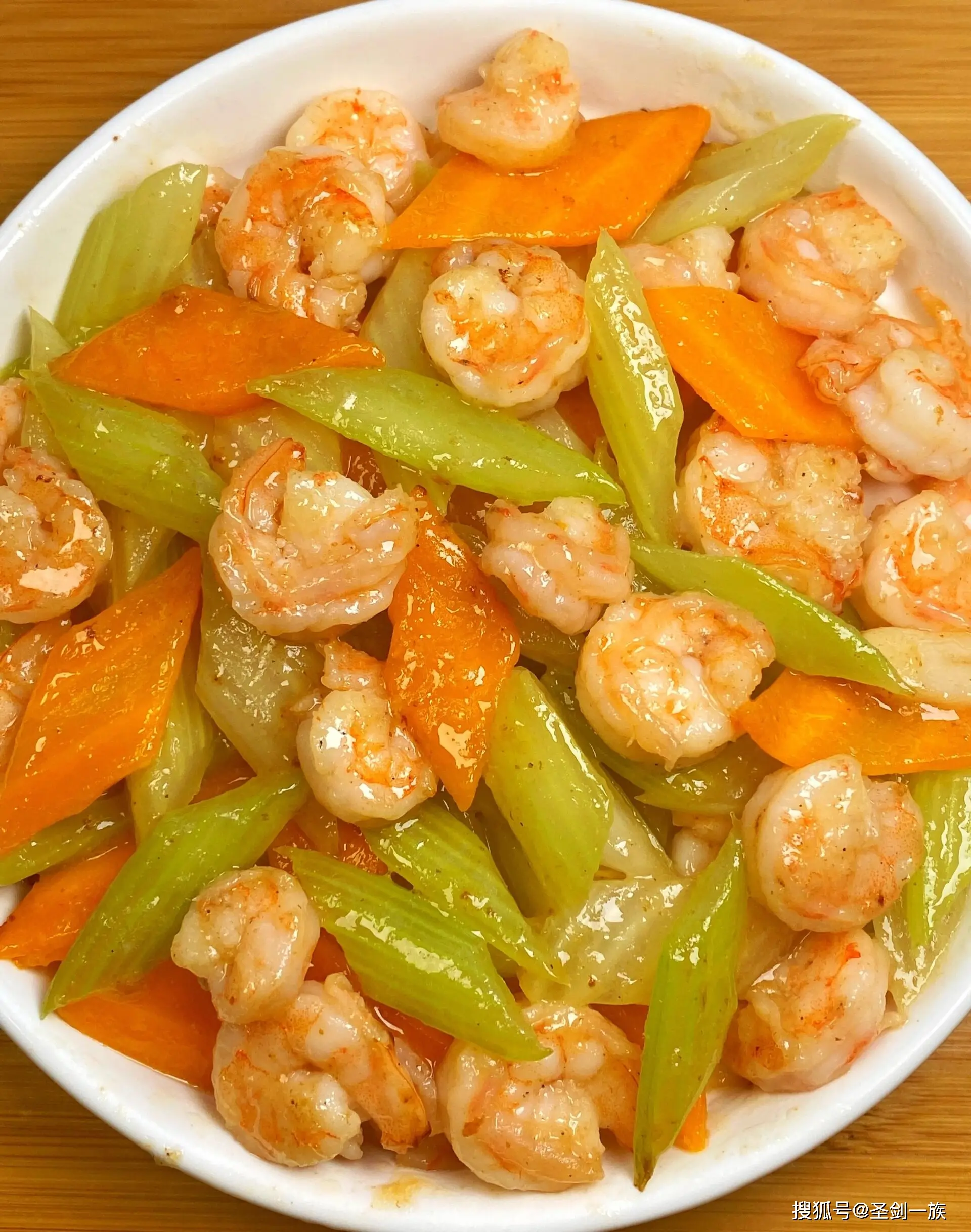 食材:西芹2根、虾仁200克、胡萝卜半根、姜蒜、盐、料酒、淀粉、白胡椒粉适量。