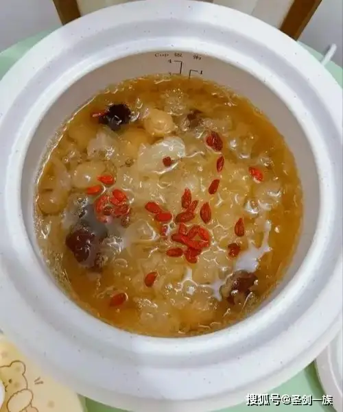 3.将银耳、红枣、桂圆放入锅中,加入适量清水,大火烧开后转小火炖煮1.5-2小时,至银耳出胶。