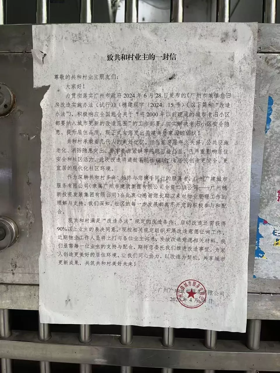 部分楼栋的大门上,至今仍张贴着4月底《致共和村业主的一封信》,告知物业工作人员将上门与业主沟通征询改造工作。但时至今日,项目仍未启动。