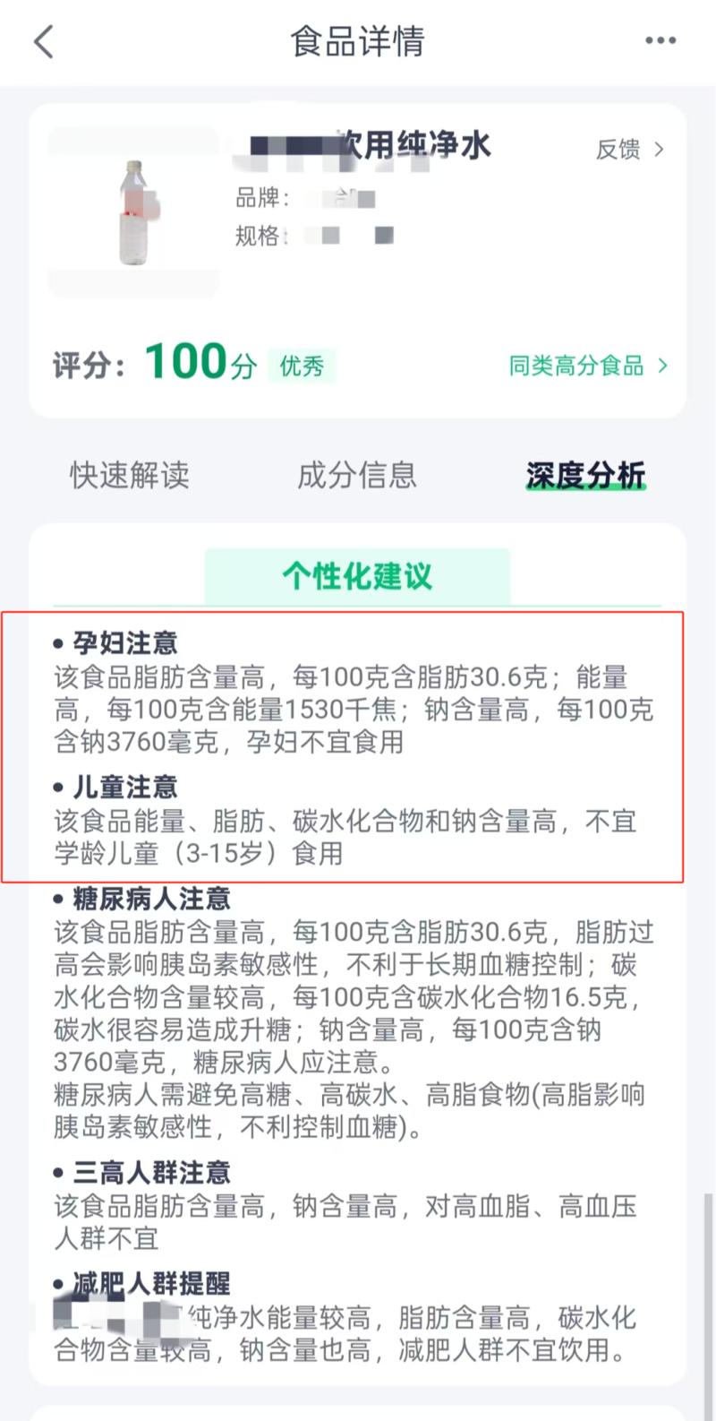 “脂肪含量高,每克含脂肪30.6克,能量高,每100克含能量1530千焦;钠含量高,每100克含3760毫克,孕妇不宜食用”的内容。换另一款矿泉水品牌测试,又显示为“能量、蛋白质、脂肪、碳水化合物、钠均为0”。
