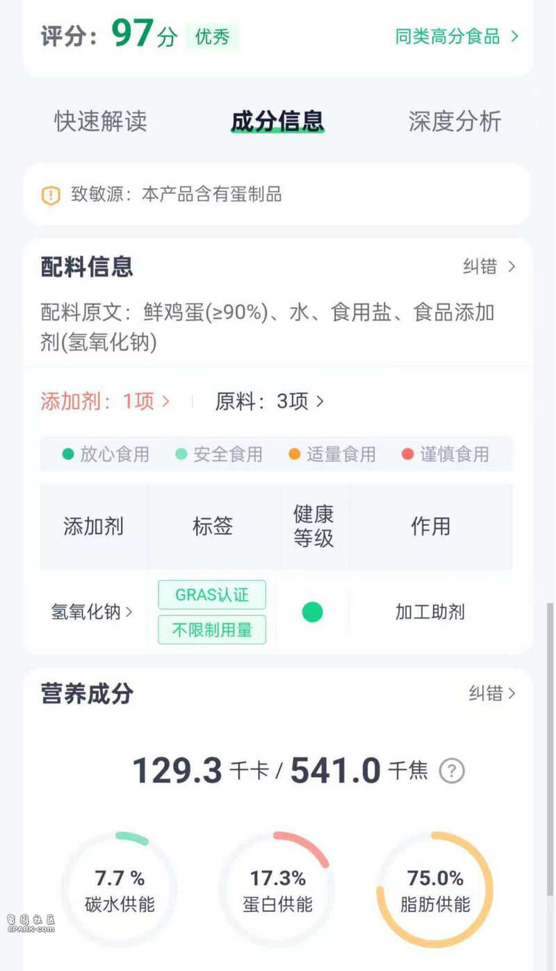 在蛋奶区,随机扫描一款松花蛋,几款软件均给出结论,也有软件给出了成分表、食用建议、营养成分等项目,部分软件还进行了打分、评级。