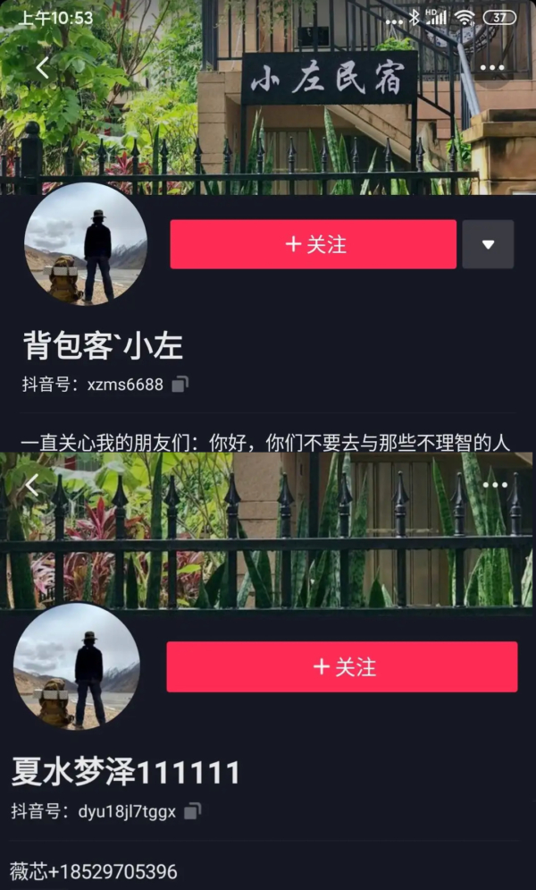 网友后来发现,“夏水梦泽111111”账号背景图片跟小左的大号背景一样,都是原来开过的民宿背景照片,怀疑“夏水梦泽111111”就是小左。