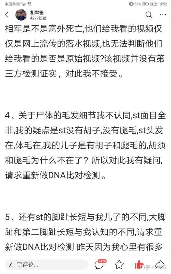 王相军的父亲还表示尸体面目全非,毛发细节也不同,尸体没有胡子,没有腿毛,跟儿子生前特征不同,并要求重新进行DNA鉴定,却遇到多重阻力。
