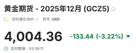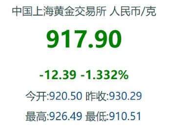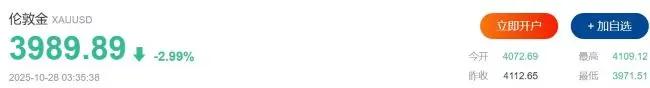 黄金在经历了近两个月的猛烈上涨后,最近几日接连大跌。美东时间10月27日下午接近4时许(伦敦时间晚间9时许),伦敦现货黄金的价格已经跌至3989.89美元/盎司;纽约黄金期货的价格则跌至4004.36美元/盎司;中国上海黄金交易所27日收盘时,金价则为每克917.9元人民币。