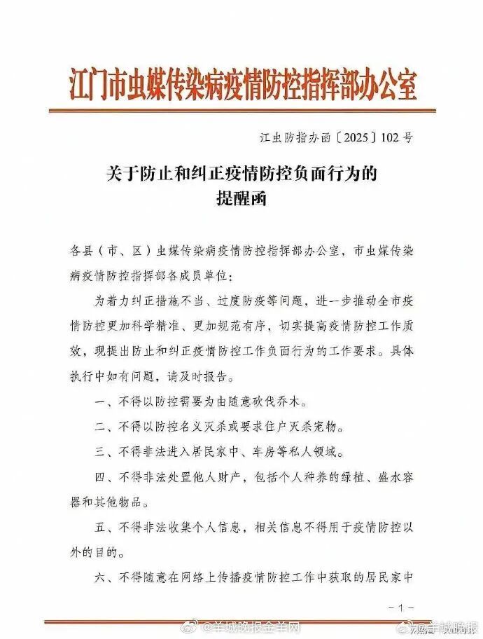 近日,广东江门市灭蚊的骚操作引起很多人的不满,媒体报道之后,江门发布了关于防止和纠正疫情防控负面行为的提醒函。